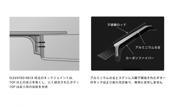 Elevated Neck 構造のネックジョイントは、Top 材との接点を無くし、広く確保されたボディTop は最大限の振動を発揮!!