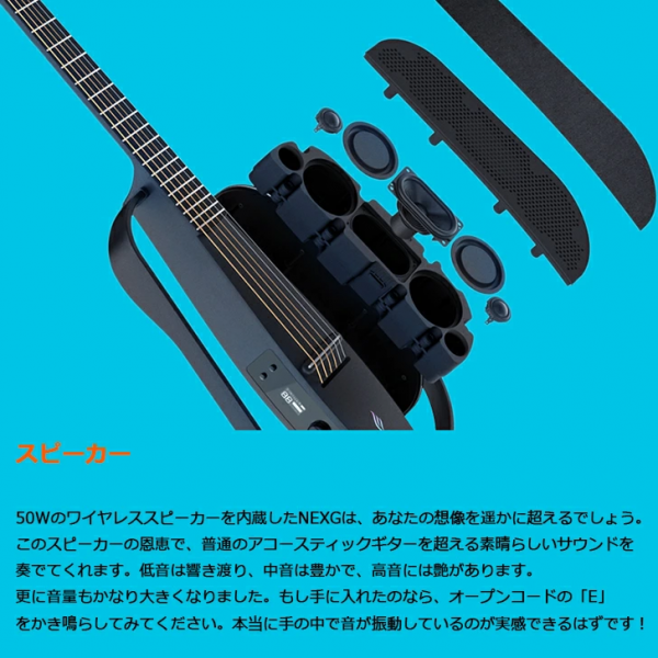 【スピーカー】50Wのワイヤレススピーカーを内蔵したNEXGは、あなたの想像を遥かに超えるでしょう。このスピーカーの恩恵で、普通のアコースティックギターを超える素晴らしいサウンドを奏でてくれます。低音は響き渡り、中音は豊かで、高音には艶があります。更に音量もかなり大きくなりました。もし手に入れたのなら、オープンコードの「E」をかき鳴らしてみてください。本当に手の中で音が振動しているのが実感できるはずです!